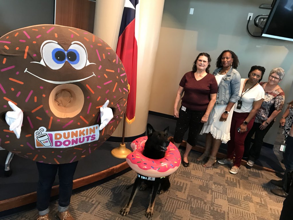 I think @DPDK9Yoll is excited for #NationalDoughnutDay #firstInLine thank you @dunkindonuts for providing the delicious doughnuts pic.twitter.com/jLyl6vnUDr