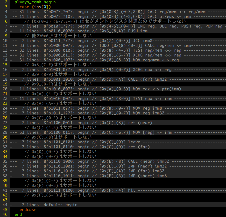 ↑大量の命令が実装済みに見えるけど、実際は命令長をデコードしてるだけで、その先の処理は全くの未完成